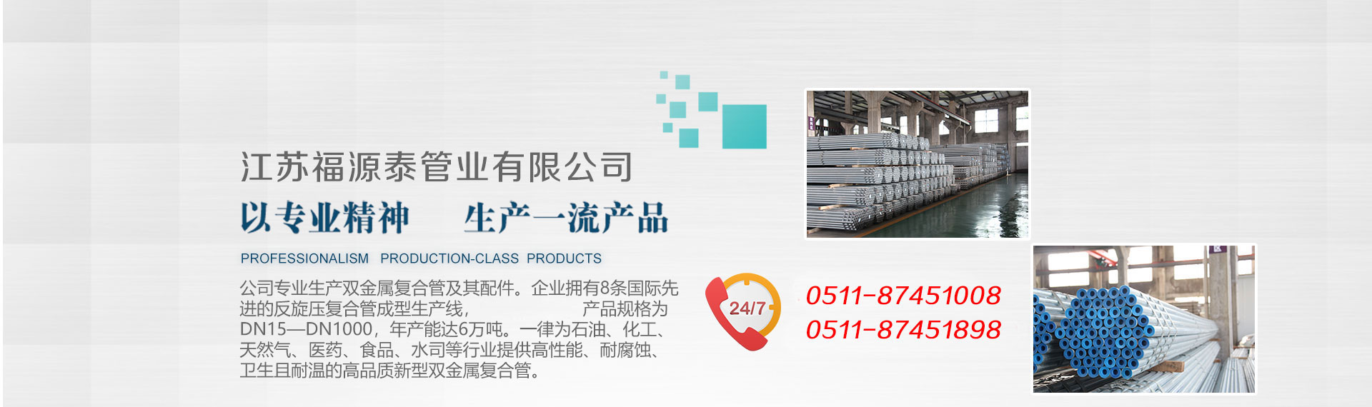 公司现有员工58人,其中博士1名,硕士3名,本科8名,专业生产双金属复合管及其配件。企业拥有8条国际先进的反旋压复合管成型生产线,并获得专利,产品规格为DN15—DN1000,年产能可达6万吨。